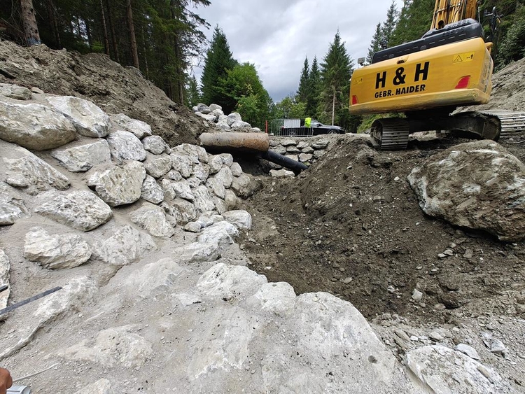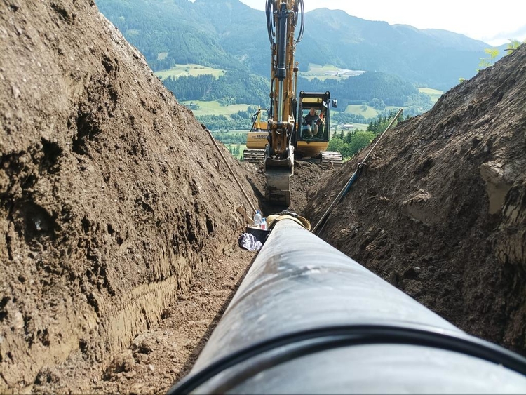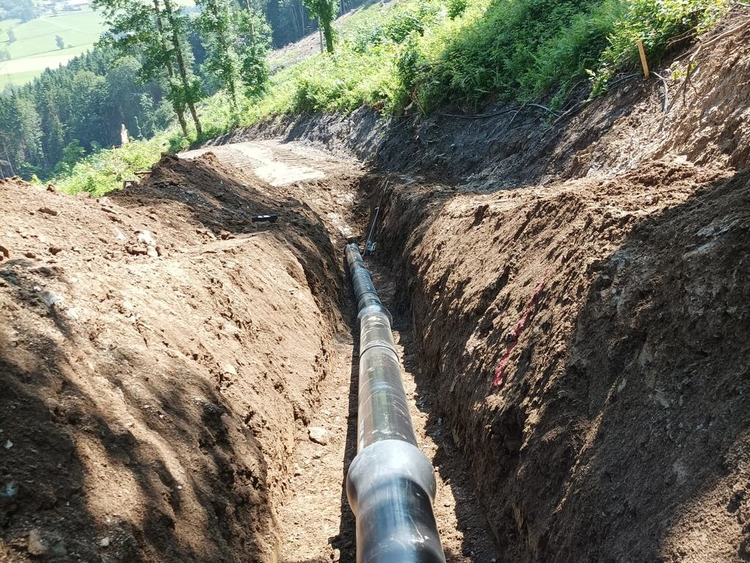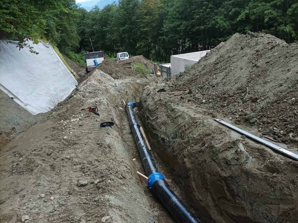 • Errichtung der Druckrohrleitung über rund 1.570 lfm aus zug- und schubfesten Gussrohren DN300, bei Geländeneigungen bis zu 38°, inklusive Verlegung der Steuerkabel