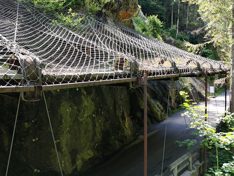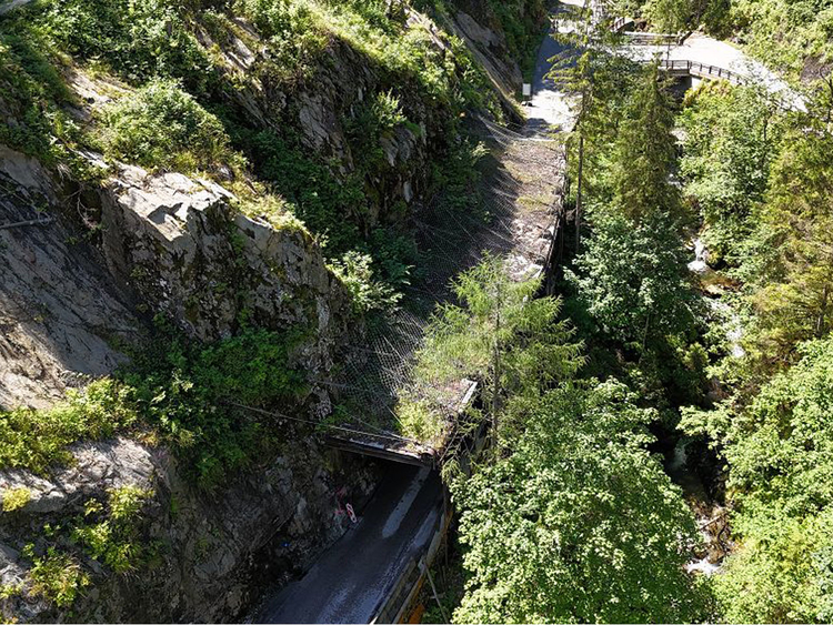 Die Steinschlagschutzdächer bestehen aus Stahlträger HEA/HEB 300, welche bergseitig auf geankerten Auflagern gelenkig gelagert, talseitig mit Formrohren 100/100/10 mit verankerten Zugsäulen aus Gewi 50 Ankerstangen ausgesteift und mit Abspannseilen DN 24 in den Fels über geankerte Befestigungspunkte zurückgehängt wurden. Über die Abspann- und zusätzlich verlegte Tragseile DN 36 wurde ein Schutznetz aus Seilen DN 8, Maschenweite 150mm mit maschinell verklemmten Netzpunkten gelegt. Im Trägerbereich wird es über Distanz- und Deformationselemente aus Stahlrohren DN 600 geführt.