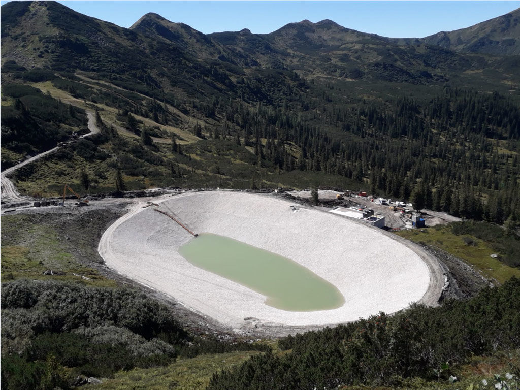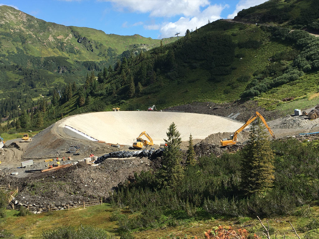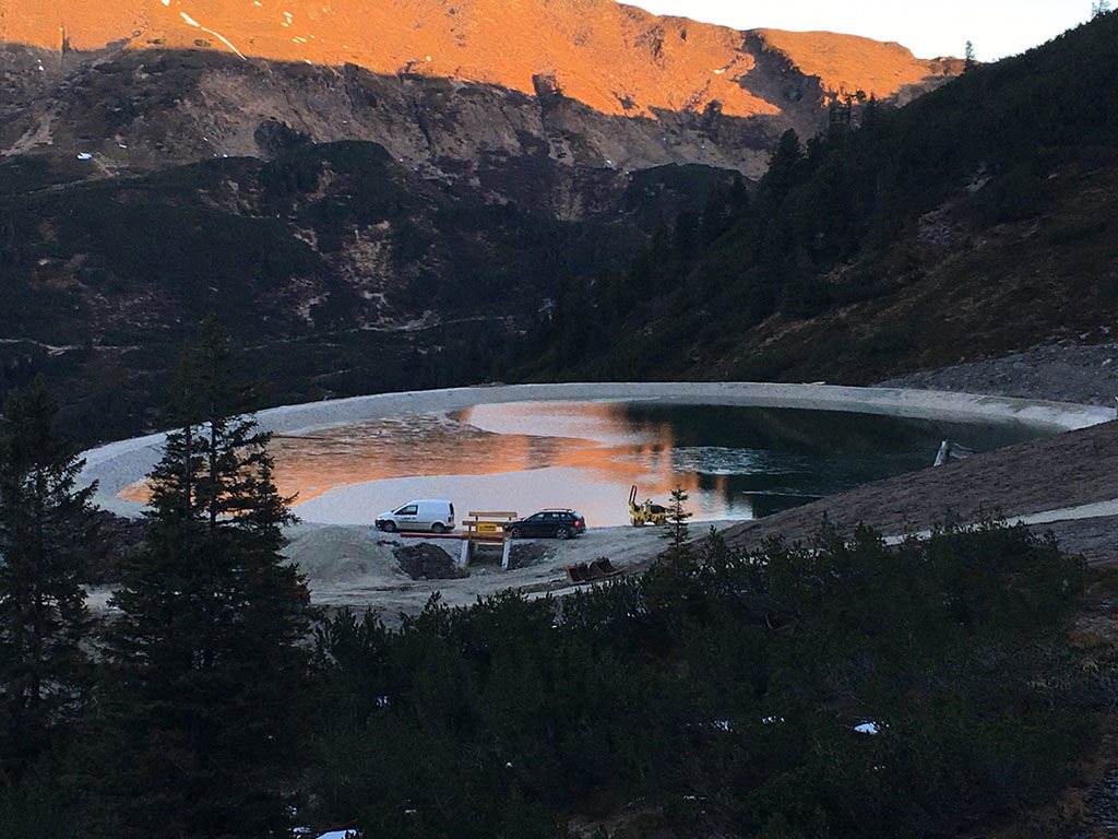 des Speichers Planneralm mit V- 50.000 m³. Die Bauarbeiten erfolgen grossteils durch GPS gesteuerte Baumaschinen der neuesten Generation wodurch eine effiziente Baudurchführung gewährleistet ist.