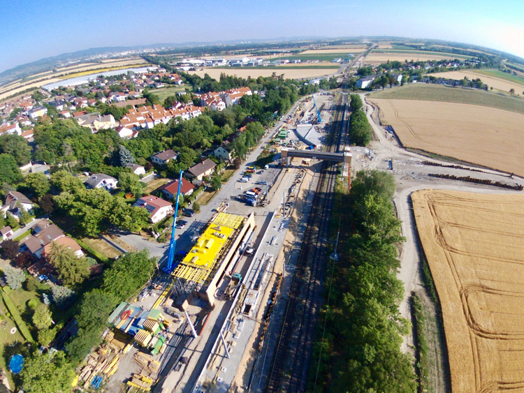 Die neue Trasse verläuft in diesem Streckenabschnitt in Dammlage bis zu 2,0 m über dem derzeitigen Gleisniveau.